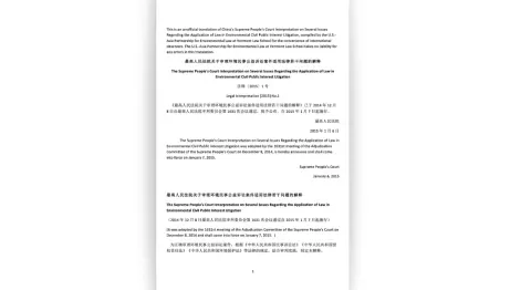 This is an unofficial translation of China’s Supreme People's Court interpretation on several issues regarding the application of law in environmental civil public interest litigation, compiled by the US- Asia Partnership for Environmental Law at Vermont Law School for the convenience of international observers. The US-Asia Partnership for Environmental Law at Vermont Law School takes no liability for any errors in this translation.